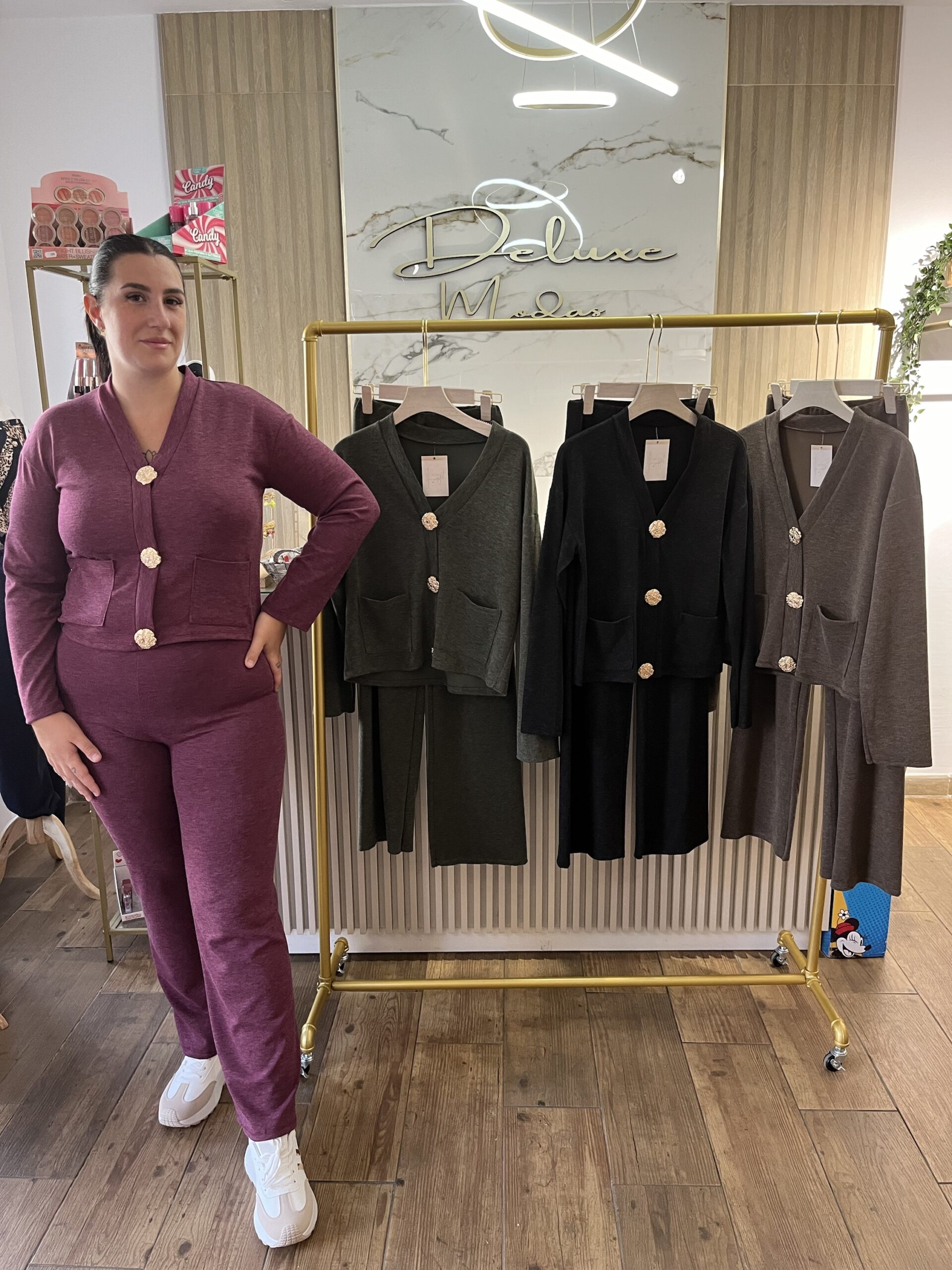 Conjunto de dos piezas con pantalón elástico . Parte de arriba con bolsillos y botones dorados de adorno . Recomendado desde 36-46