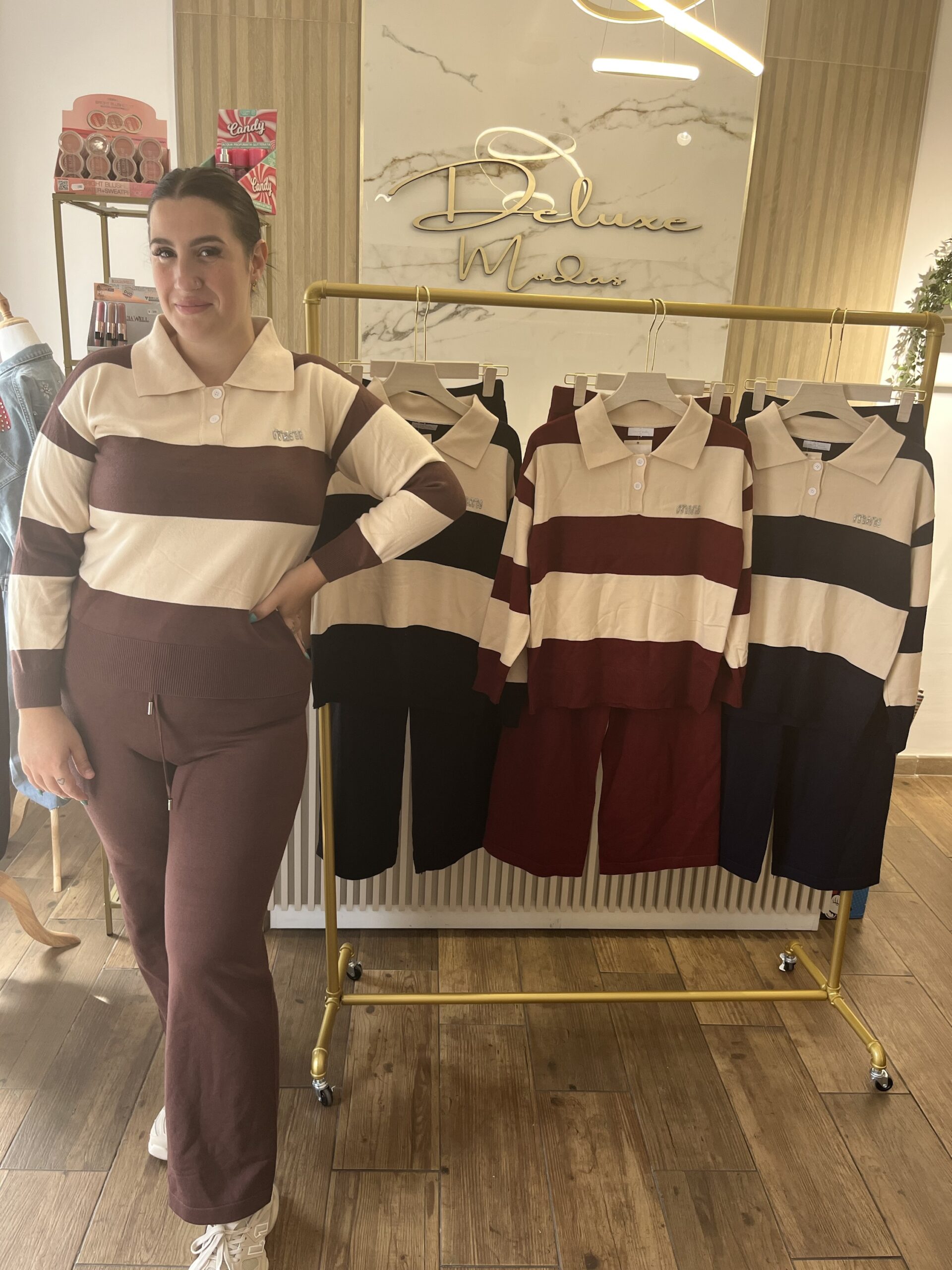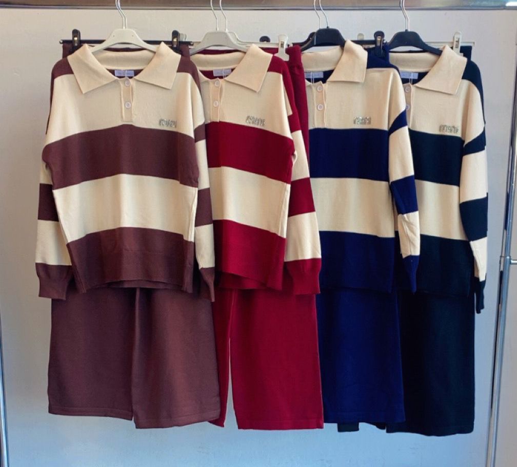 Conjunto tejido punto . Compuesto por dos partes . La parte superior es tipo polo con detalle en el pecho de la inspiración Miu en glitter . El pantalón lleva cintura elástica y cordón para ajustar . Talla única , recomendada desde 36-46