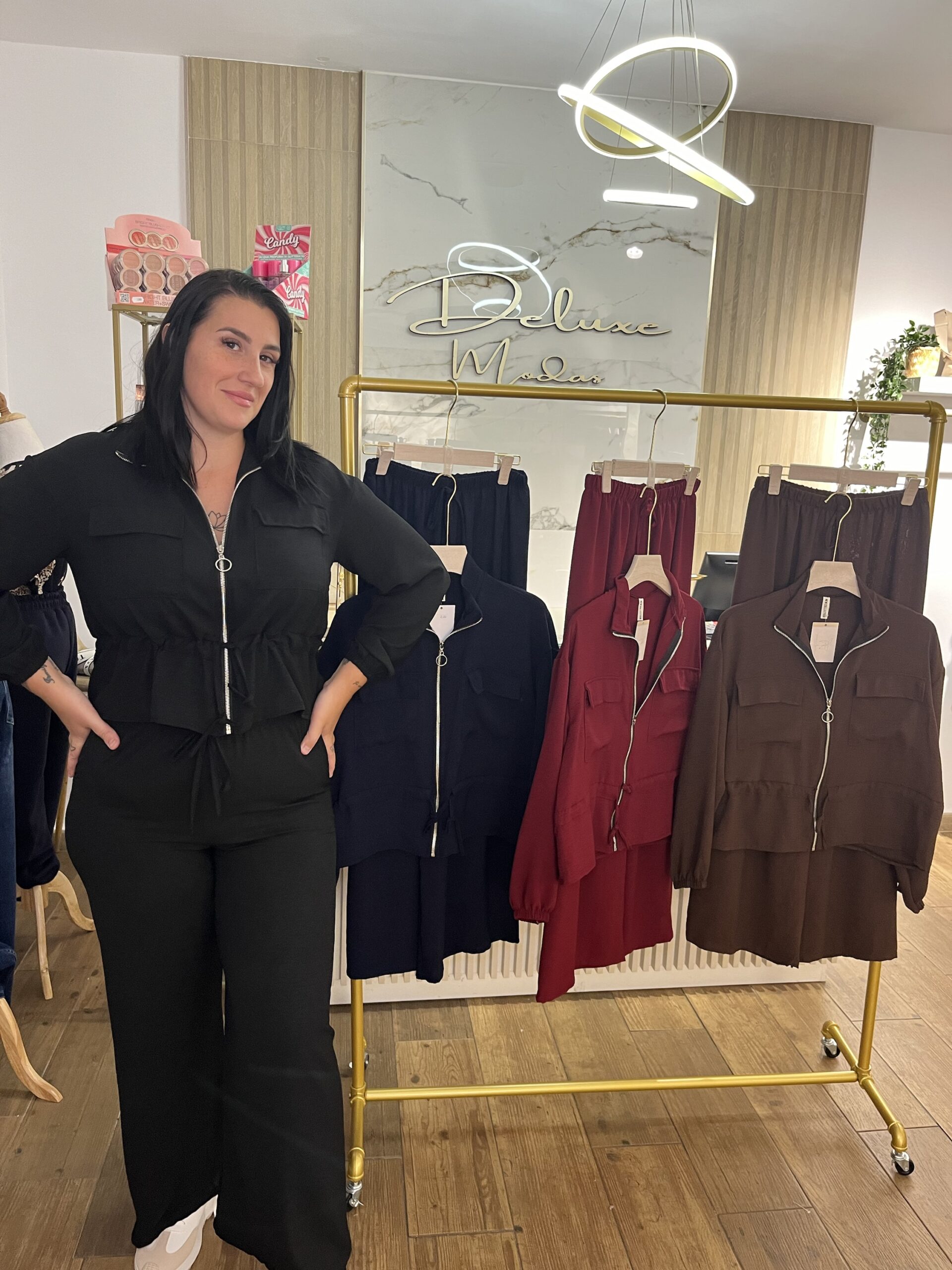 Conjunto tipo gasa . Compuesto por dos piezas ; pantalón con cintura elástica y parte de arriba con cremalleras y cuerda en la cintura para ajustar la chaqueta . Talla única . Recomendado desde 36 a 46 . La modelo usa talla 42/44 .