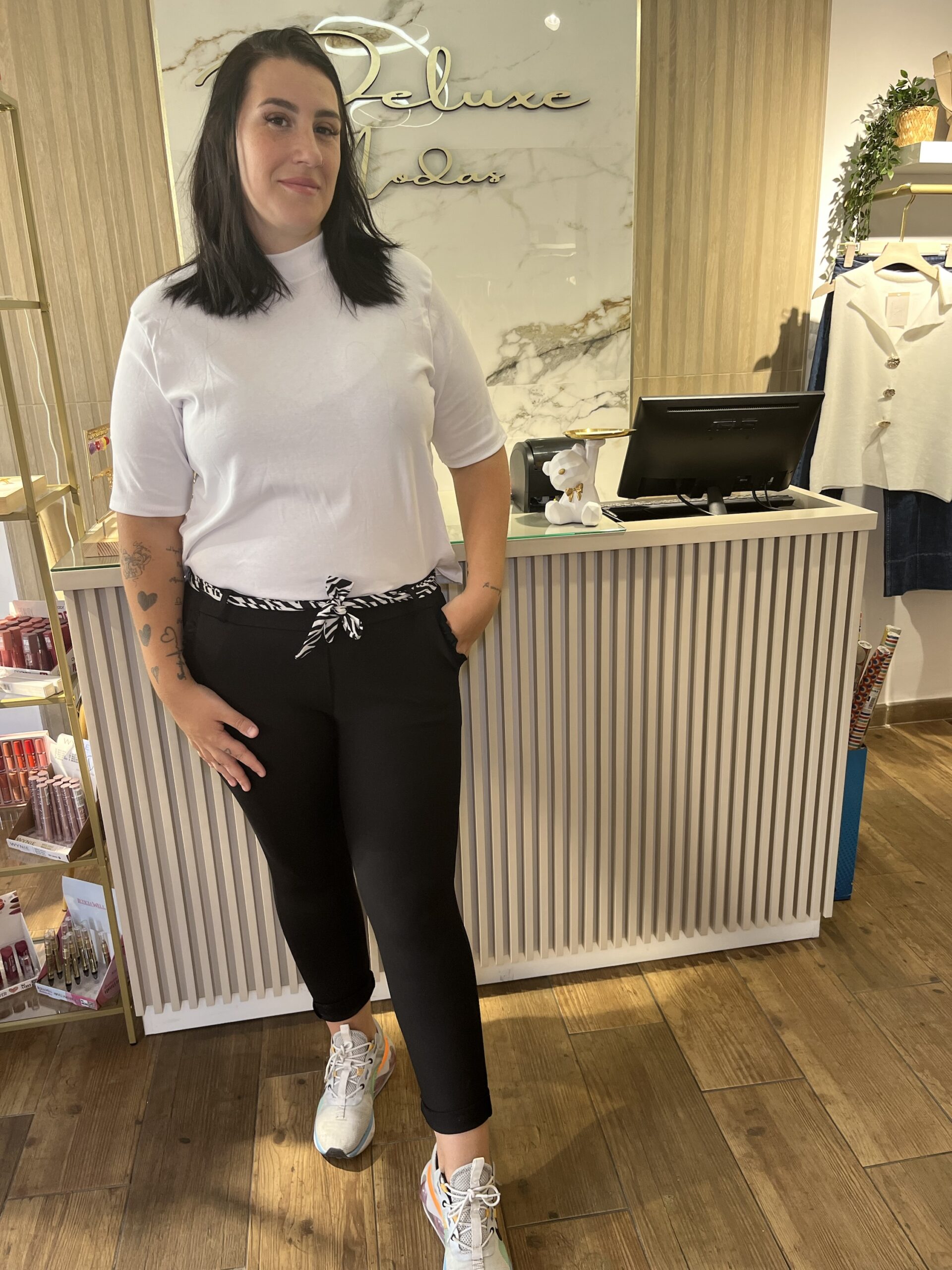 Pantalón elástico con cintura elástica y lleva detalle de pañuelo en la cintura . Se puede quitar . Va por tallas desde S hasta xxl . La modelo lleva talla xxl